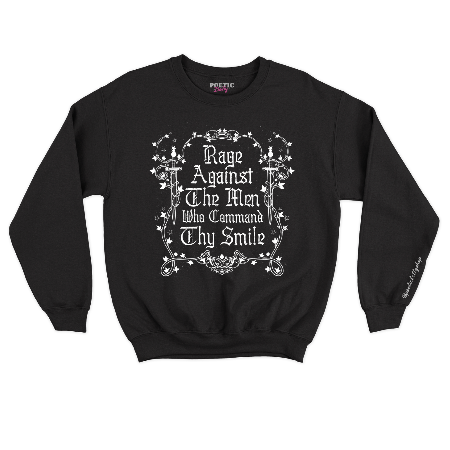 For anyone who's been told to "smile more" or told they'd be "prettier if they smiled," this new sweatshirt is for you. Drawing inspiration from the dark ages, which sometimes don’t feel so far behind us... Wear your defiance: Rage Against The Men Who Command Thy Smile. Also available as a tote bag and a mug.