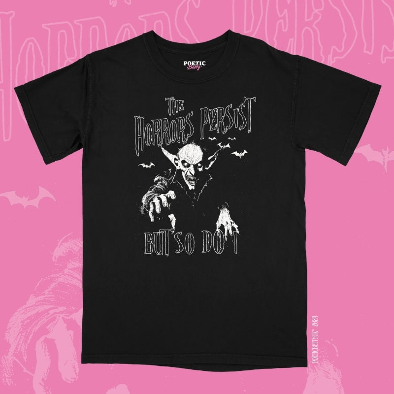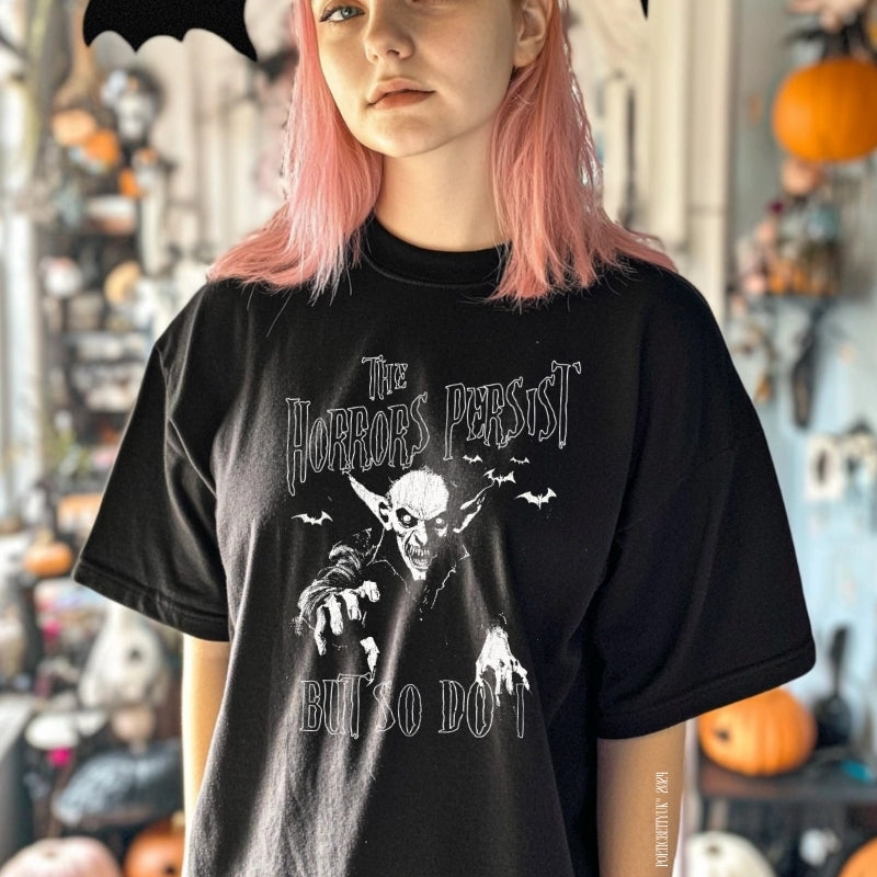 The Horrors Persist, But So Do I and you will in our new Nosferatu vampire gothic grunge tee. This shirt is from our 13 Days of Halloween Collection.