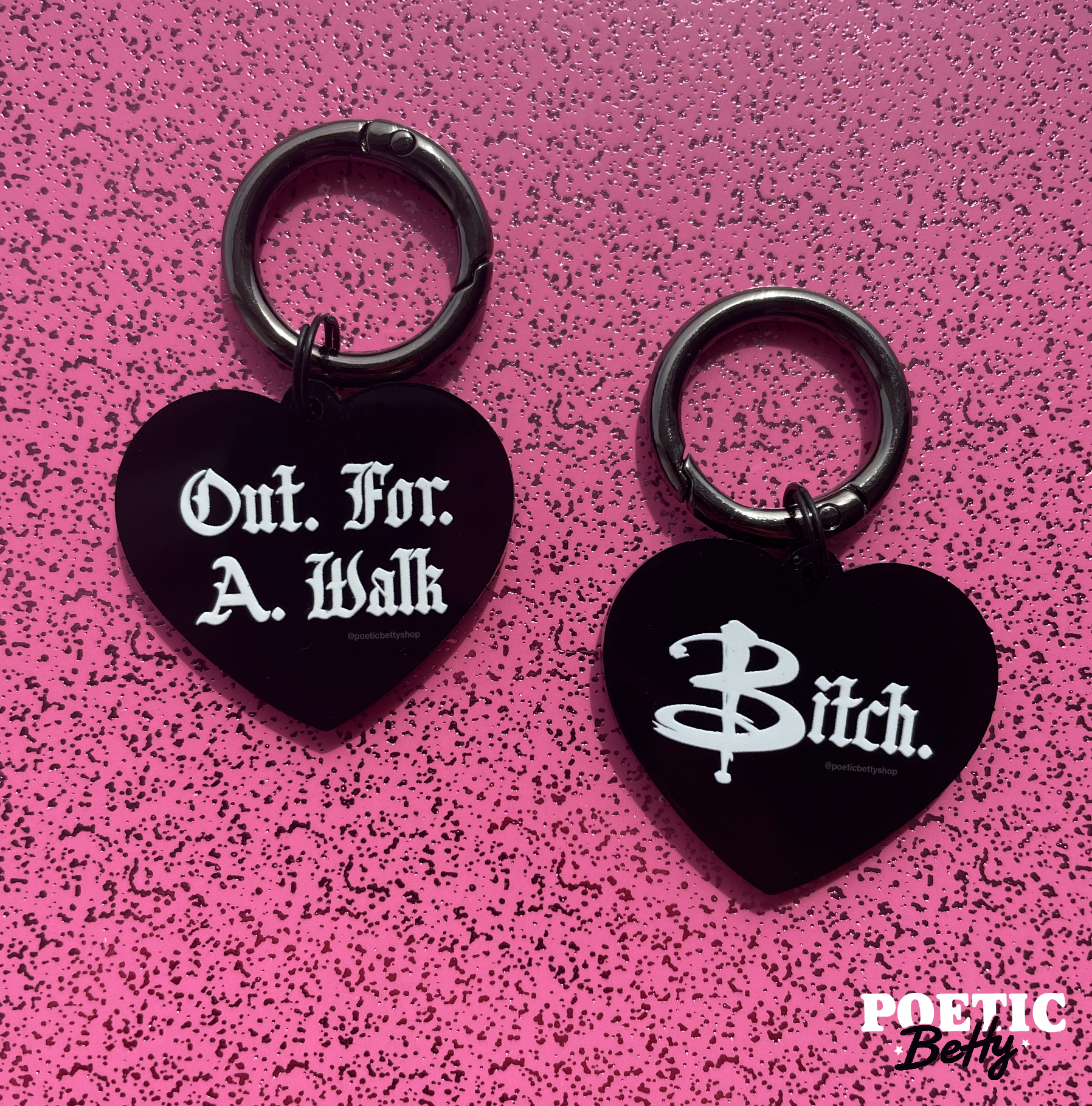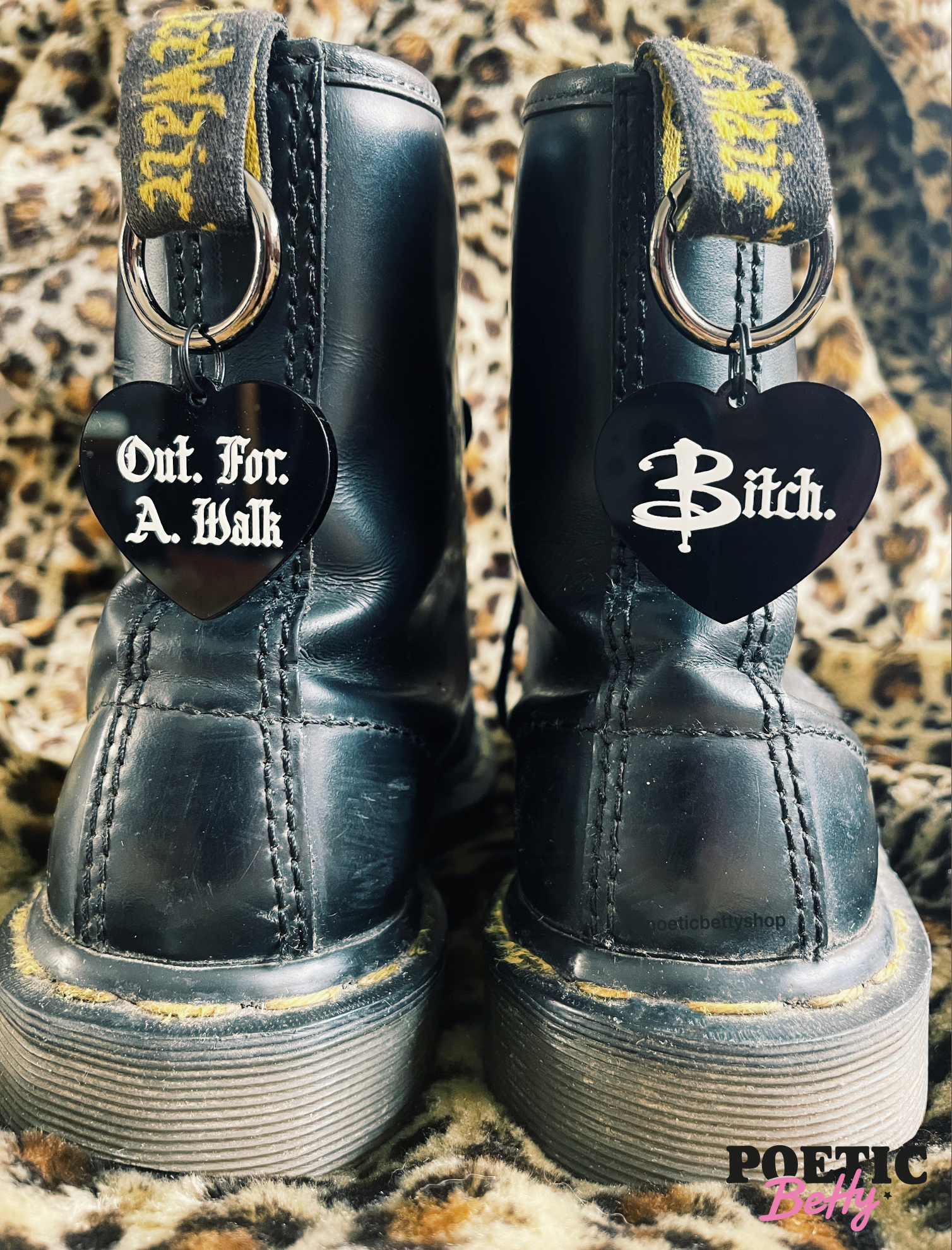 What are you doing here? Five Words or less... Out. For. A. Walk... Bitch! One of Spike's most iconic lines from Buffy is immortalised as exclusive black acrylic heart boot charms. Designed by Poetic Betty, these beautiful charms can be attached to your Dr Marten airwair loops with a special trigger gate ring that is fully secure.